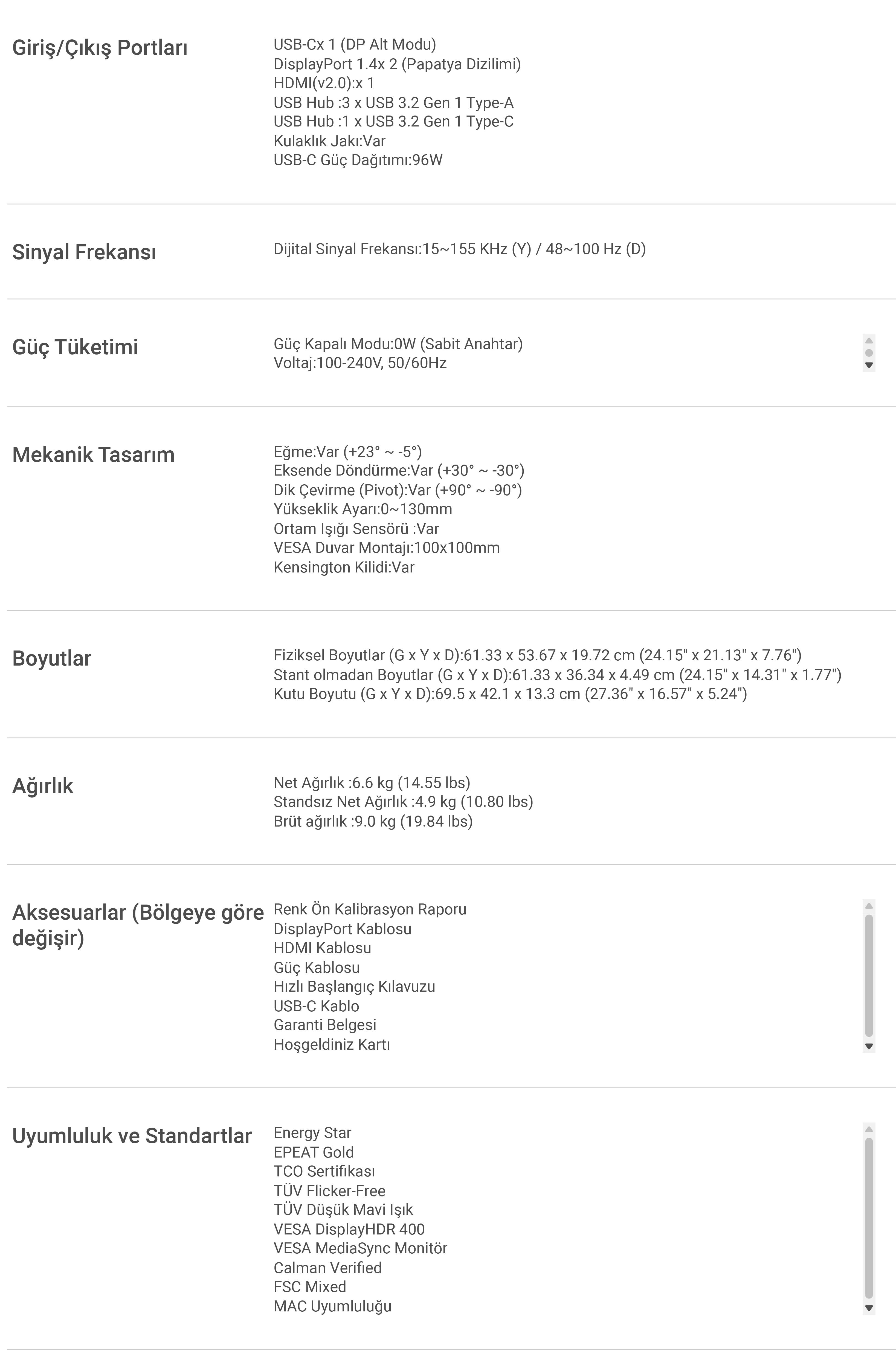 Parlaklık (HDR, Maks.):400 cd/ ㎡